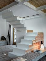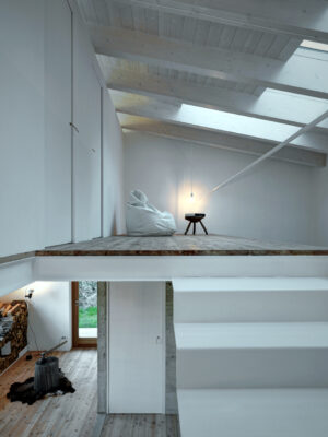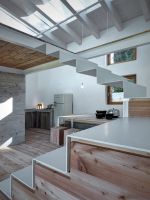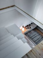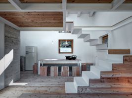 On the south side the residence is in adherence to another building, but it is entirely free on the remainding sides (east, north and west). I have therefore had to pay special attention to the illuminating engineering, above all because the most exposed side is that to north. The ground floor was initially used as office and the residence was completely developed on the first floor, accessible by external staircase. The idea was to connect the two floors in order to have an entirely new housing unit, with different roles: a living space with garden and big windows on the ground floor and a sleeping space on the first floor. The focus of this proposal is represented by the inside staircase that connects and defines an artificial division, on the ground floor, between the living and the kitchen. On the first floor the same artificial division allows to reach a study space, through which we get the access to the master bedroom, with private bathroom and walk-in closet, to the other two bedrooms and bathroom. The importance of the staircase has also been emphasized by the use of several colors and materials. The kicks have been madeout of iron and painted with white color, while the floors of the whole apartment are in woodoak.