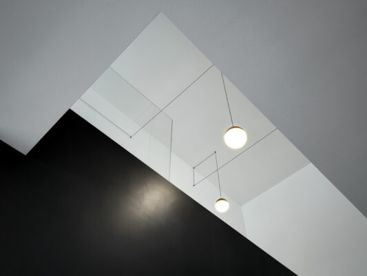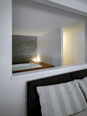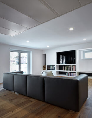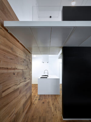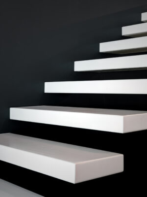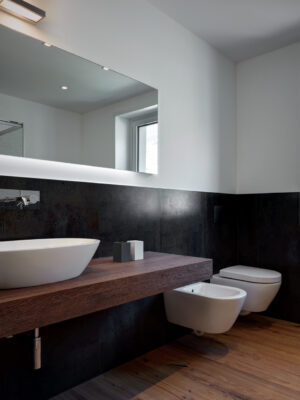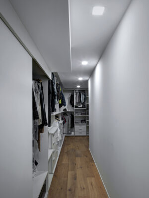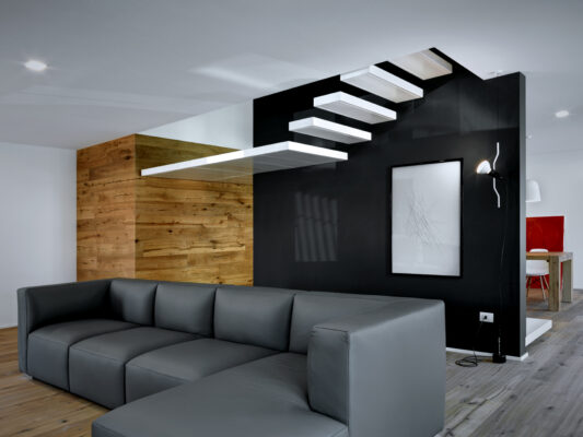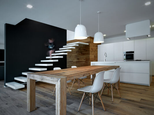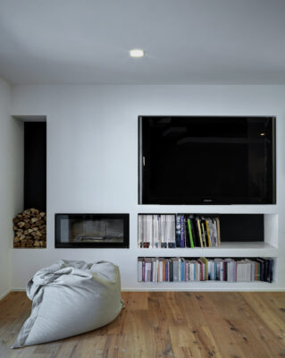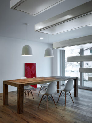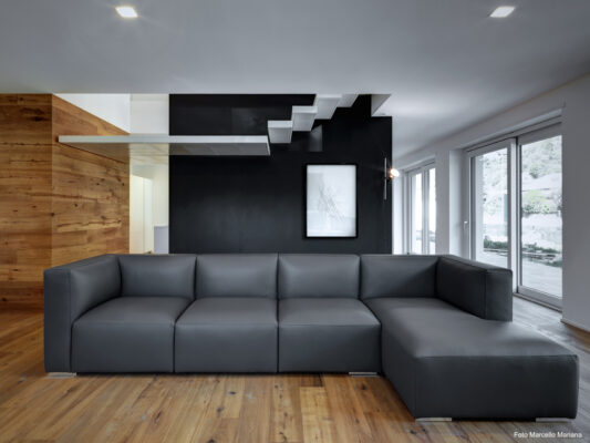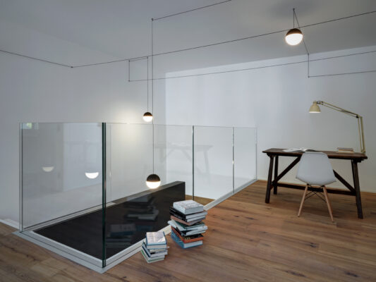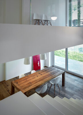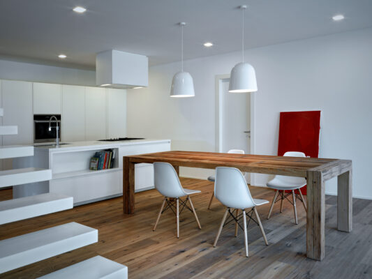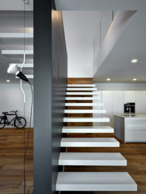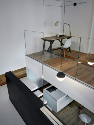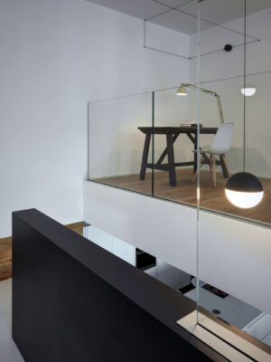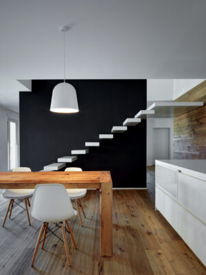 On the south side the residence is in adherence to another building, but it is entirely free on the remainding sides (east, north and west). I have therefore had to pay special attention to the illuminating engineering, above all because the most exposed side is that to north. The ground floor was initially used as office and the residence was completely developed on the first floor, accessible by external staircase. The idea was to connect the two floors in order to have an entirely new housing unit, with different roles: a living space with garden and big windows on the ground floor and a sleeping space on the first floor. The focus of this proposal is represented by the inside staircase that connects and defines an artificial division, on the ground floor, between the living and the kitchen. On the first floor the same artificial division allows to reach a study space, through which we get the access to the master bedroom, with private bathroom and walk-in closet, to the other two bedrooms and bathroom. The importance of the staircase has also been emphasized by the use of several colors and materials. The kicks have been madeout of iron and painted with white color, while the floors of the whole apartment are in woodoak.